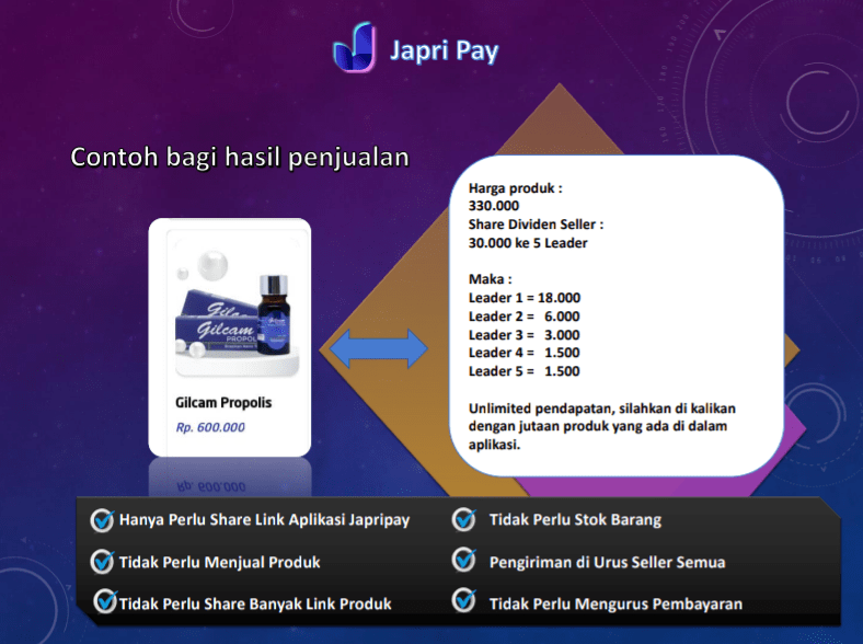3. BONUS BAGI HASIL PENJUALAN E-COMMERCE JAPRIME Bonus bagi hasil penjualan ini di hitung sampai 15 level= L1 = 3000 L2 = 1000 L3 = 500 L4 = 250 L5 = 250 L6 = 250 L7 = 250 L8 = 125 L9 = 125 L10 = 125 L11 = 125.